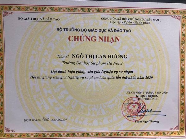 Năm 2020, cô được Bộ Giáo dục và Đào tạo trao bằng chứng nhận Giảng viên giỏi Nghiệp vụ Sư phạm - Hội thi giảng viên Giỏi Nghiệp vụ sư phạm toàn quố lần thứ nhất. Đó là một minh chứng cho năng lực chuyên môn và tâm huyết với nghề.