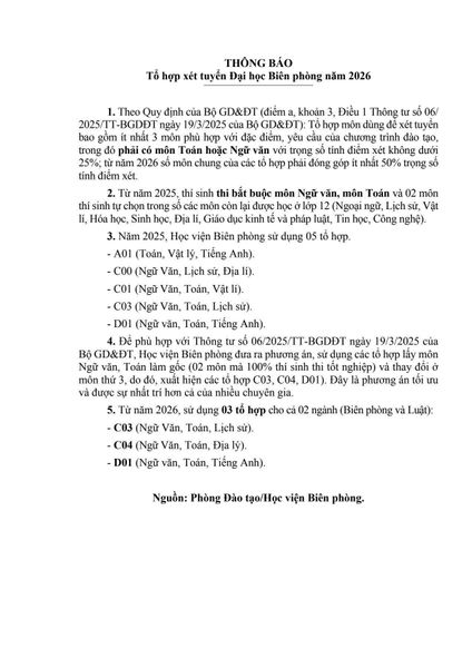 Từ năm 2026, Học viện Biên phòng chỉ xét tuyển 3 tổ hợp cho cả hai ngành biên phòng và luật, gồm C03 (văn, toán, sử), C04 (văn, toán, địa), D01 (văn, toán, tiếng Anh).