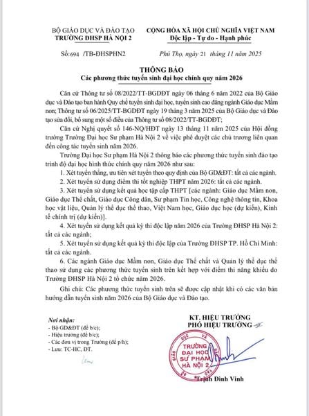 Trường đại học Sư phạm Hà Nội 2 lưu ý các phương thức tuyển sinh trên sẽ được cập nhật khi có các văn bản hướng dẫn tuyển sinh năm 2026 của Bộ Giáo dục và Đào tạo.
