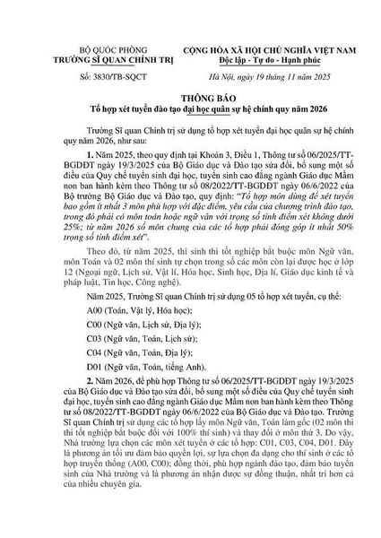 Ngày 19-11, Trường Sĩ quan Chính trị, Bộ Quốc phòng, thông báo tổ hợp xét tuyển đại học hệ quân sự chính quy năm 2026, đáng chú ý nhà trường sẽ bỏ xét tổ hợp C00 và A00 so với năm ngoái.