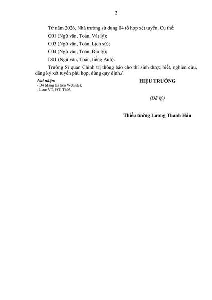 Theo đó từ năm 2026, Trường Sĩ quan Chính trị sử dụng bốn tổ hợp xét tuyển, gồm: C01 (văn, toán, lý), C03 (văn, toán, sử), C04 (văn, toán, địa), D01 (văn, toán, tiếng Anh). So với năm ngoái, Trường Sĩ quan Chính trị đã bỏ tổ hợp C00 (văn, sử, địa), A00 (toán, lý, hóa).
